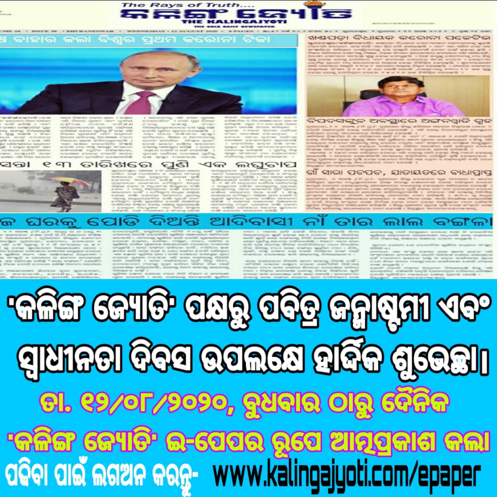 ‘କଳିଙ୍ଗ ଜ୍ୟୋତି’ ପକ୍ଷରୁ ପବିତ୍ର ଜନ୍ମାଷ୍ଟମୀ ଏବଂ ସ୍ୱାଧୀନତା ଦିବସ ଉପଲକ୍ଷେ ହାର୍ଦ୍ଦିକ ଶୁଭେଚ୍ଛା । Breaking NewsLlifestyleNational-International By Kalinga Jyoti Last updated Aug 12, 2020 0 711 Share ତା.୧୨/୦୮/୨୦୨୦, ବୁଧବାର ଠାରୁ ଦୈନିକ ‘କଳିଙ୍ଗ ଜ୍ୟୋତି’ ଇ-ପେପର ରୂେପ ଆତ୍ମପ୍ରକାଶ କଲା । ପଢିବାକୁ ଲଗଅନ କରନ୍ତୁ – www.kalingajyoti.com/epaper Kalinga Jyoti byurochief reporterkalinga jyotikhabarnewsodia samajaodia sambadodisha