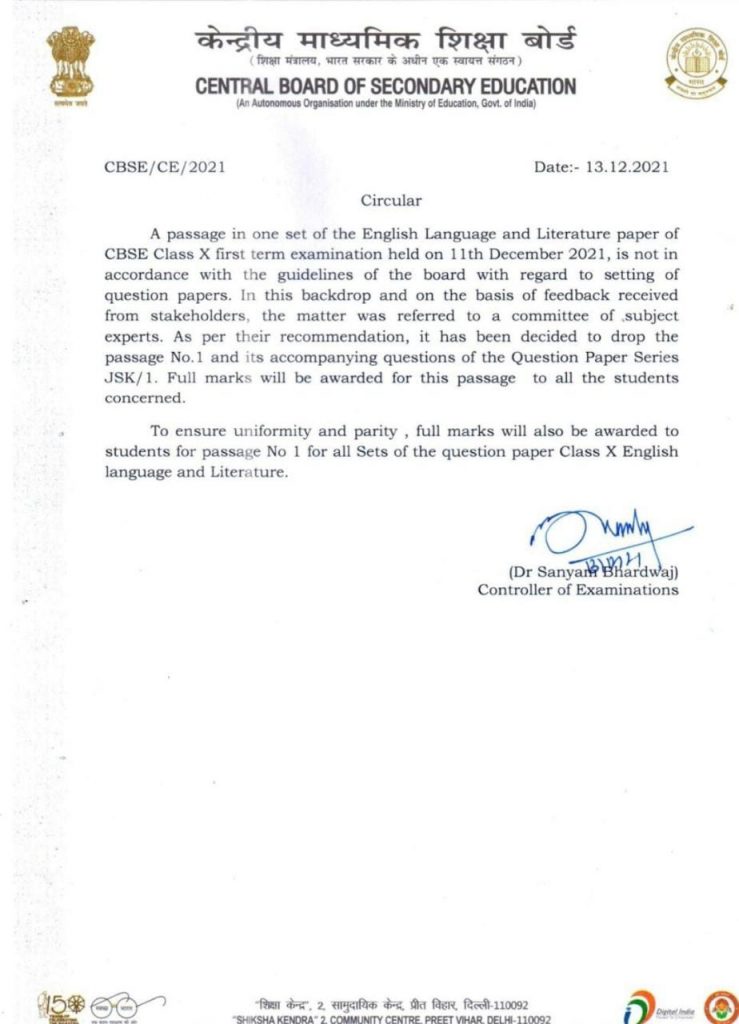 ଉଲ୍ଲେଖଯୋଗ୍ୟ, ଡିସେମ୍ବର ୧୧ ତାରିଖରେ ସିବିଏସ୍ଇର ୧୦ମ ଶ୍ରେଣୀ ପାଇଁ ହୋଇଥିବା ଇଂରାଜୀ ଭାଷା ଓ ସାହିତ୍ୟ ପରୀକ୍ଷା ପ୍ରଶ୍ନପତ୍ରରେ ଗୋଟିଏ ପ୍ରଶ୍ନ ସିଲାବସ୍ ଓ ଧାର୍ଯ୍ୟ ଗାଇଡ୍ଲାଇନ୍ ବାହାରୁ ରହି ଯାଇଥିବା ଜଣାପଡ଼ିବା ପରେ ଏହାକୁ କେନ୍ଦ୍ର କରି ଛାତ୍ରଛାତ୍ରୀ ଓ ଅଭିଭାବକ ମହଲରେ ତୀବ୍ର ଅସନ୍ତୋଷ ଓ ପ୍ରତିକ୍ରିୟା ପ୍ରକାଶ ପାଇଥିଲା। ଏନେଇ ସିବିଏସ୍ଇ କର୍ତ୍ତୃପକ୍ଷଙ୍କ ଦୃଷ୍ଟି ଆକର୍ଷଣ କରାଯିବା ପରେ ଆଜି ଏହି ଘୋଷଣା କରିଛନ୍ତି ସିବିଏସ୍ଇ କର୍ତ୍ତୃପକ୍ଷ।